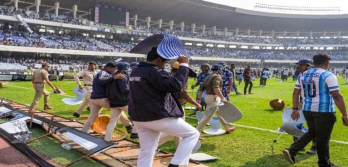 मेस्सी के समय से पहले मैदान से निकलने की खबर फैलते ही दर्शकों का गुस्सा फूट पड़ा. मैदान में बोतलें और फिर प्लास्टिक की कुर्सियां भी फेंकी गईं. प्रायोजक बैनर और होर्डिंग फाड़ दिए गए, बड़ी संख्या में सीटें तोड़ दी गईं और भीड़ ने मैदान के कुछ हिस्सों में जबरन घुसने के लिए बैरिकेड्स को तोड़ने की कोशिश की.